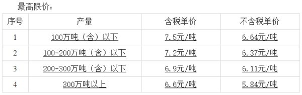 本次投標(biāo)最高限價方面,產(chǎn)量100萬噸以下,7.5元/噸;產(chǎn)量100-200萬噸以下,7.2元/噸;產(chǎn)量200-300萬噸以下,6.9元/噸;產(chǎn)量300萬噸以上,6.6元/噸,價格均為含稅單價。增值稅稅率為13%。