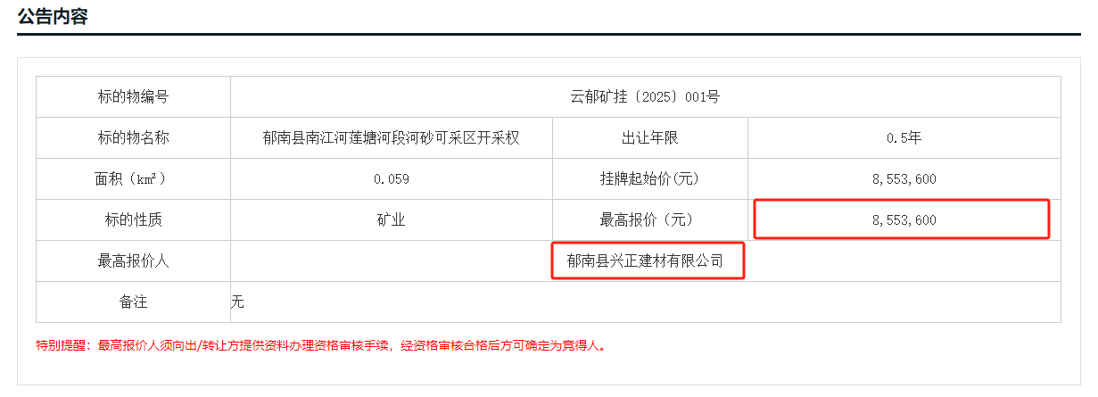 近日,廣東省云浮市郁南縣發布郁南縣南江河蓮塘河段河砂可采區開采權第二次掛牌競價結果公告,郁南縣興正建材有限公司以855.36萬元成功競得該項目。 根據出讓公告,郁南縣南江河蓮塘河段河砂可采區開采權,位于南江口鎮蓮塘村至杉坪村對出的1400米南江河段。采區長度約為1400m,平均開挖寬約42m,平均開采深度2.0m,開采面積約5.94萬㎡,控制采砂量為11.88萬m³,開采時間為6個月,掛牌起始價為人民幣855.36萬元(每立方米河砂72元)。 此次掛牌為該項目第二次出讓,該項目首次掛牌為2024年9月5日,掛牌起始為950.4萬元(每立方米河砂80元),但于2024年10月14日流拍,本次出讓降價95.04萬元,終于成功出讓!