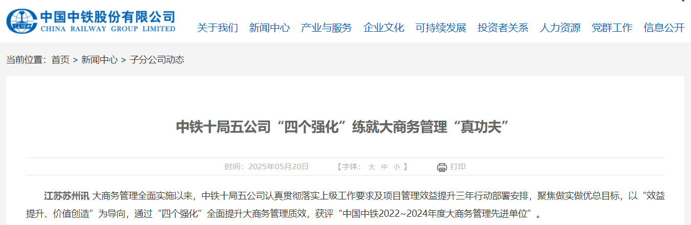 大商務(wù)管理全面實(shí)施以來,中鐵十局五公司認(rèn)真貫徹落實(shí)上級(jí)工作要求及項(xiàng)目管理效益提升三年行動(dòng)部署安排,聚焦做實(shí)做優(yōu)總目標(biāo),以“效益提升、價(jià)值創(chuàng)造”為導(dǎo)向,通過“四個(gè)強(qiáng)化”全面提升大商務(wù)管理質(zhì)效,獲評(píng)“中國(guó)中鐵2022~2024年度大商務(wù)管理先進(jìn)單位”。