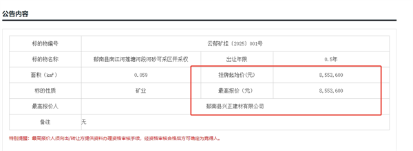 日前,廣東云浮市公共資源交易服務平臺發布郁南縣南江河蓮塘河段河砂可采區開采權第2次掛牌競價結果公告。郁南縣興正建材有限公司以底價855.36萬元成功競得該項目,約72元/方。