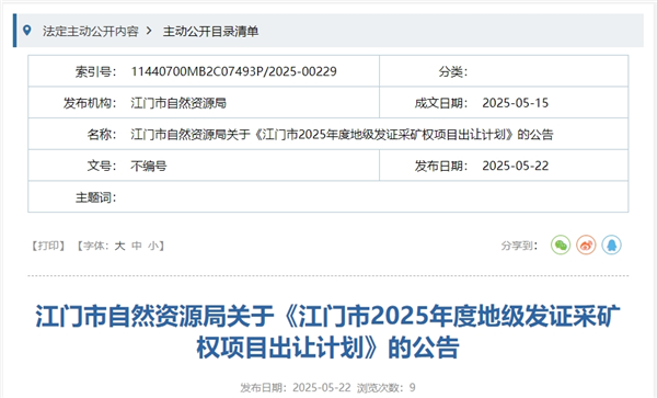 日前,廣東省江門市自然資源局發布《江門市2025年度地級發證采礦權項目出讓計劃》。根據計劃,2025年江門計劃出讓8宗采礦權,含7宗砂石礦。截至目前,已有1宗240萬方/年砂石礦正在掛牌公告中,該礦將于2025年6月13日結束掛牌。