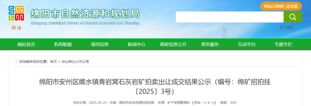 綿陽市安州區雎水鎮青巖窩石灰巖礦采礦權網上拍賣出讓成交公示