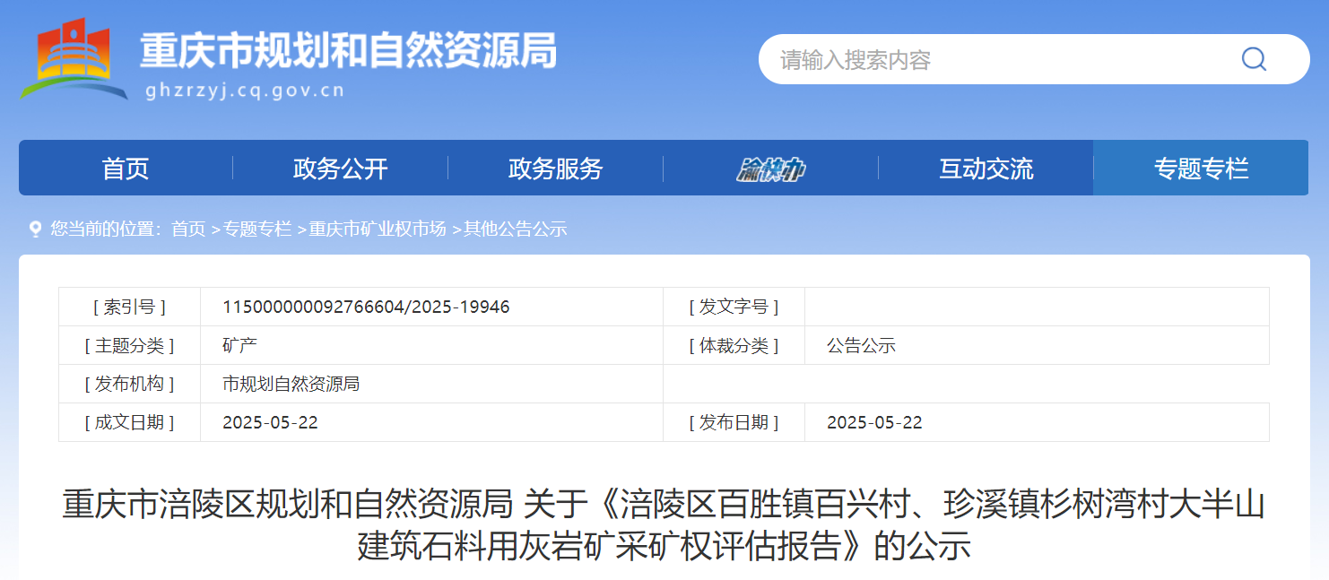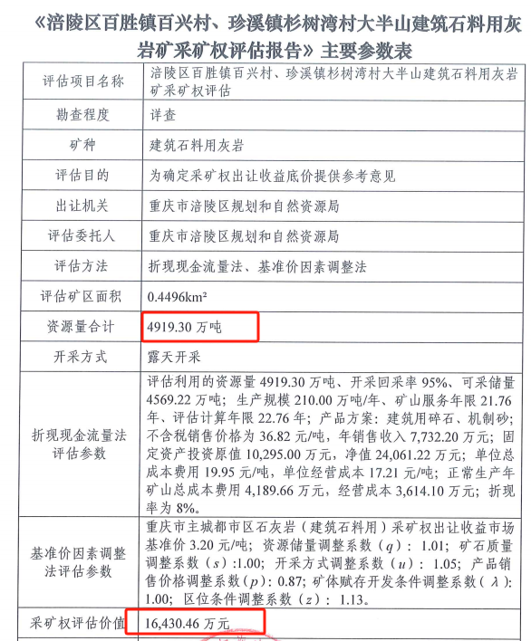據悉,近日,重慶市規劃和自然資源局公示對涪陵區百勝鎮百興村、珍溪鎮杉樹灣村大半山建筑石料用灰巖礦采礦權評估報告,該礦權或將近期出讓。該礦區范圍內資源量4919.30萬噸,可采儲量4569.22萬噸;生產規模210萬噸/年、礦山服務年限21.76年,評估價值為人民幣16430.46萬元。