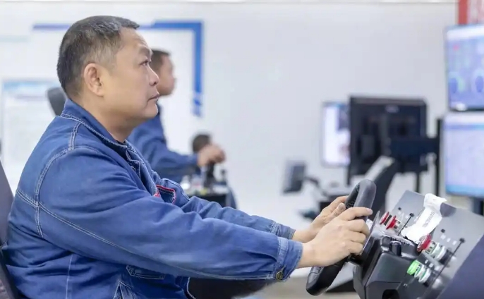 在智慧管控中心的控制室,數臺遠程操控座艙分列兩側依次排開,一群工作人員坐在智控座艙上,有的擺弄操縱桿,有的轉動方向盤,眼睛則不約而同地緊盯屏幕,乍眼一看,仿佛在玩電腦游戲。