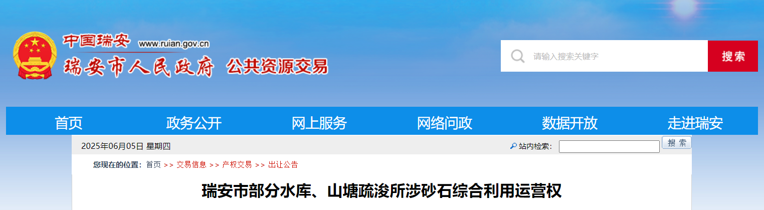 近日,浙江省溫州市瑞安市公共資源交易中心發布瑞安市部分水庫、山塘疏浚所涉砂石綜合利用運營權轉讓公告,疏浚工程所涉砂石料資源約3650萬方,起始價61599.41萬元,單價約為16.8元/方。