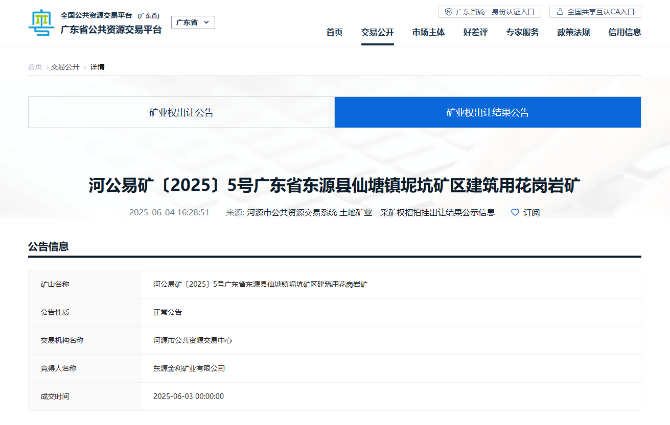近日,河源市公共資源交易平臺成功競出廣東省東源縣仙塘鎮坭坑礦區建筑用花崗巖礦。礦區范圍內(標高+267m~+70m)累計查明及保有建筑用花崗巖礦資源量礦石量807.49萬立方米,開采規模為70萬立方米/年,出讓年限為12年,東源金利礦業有限公司最終以底價2142.38萬元競得此礦。