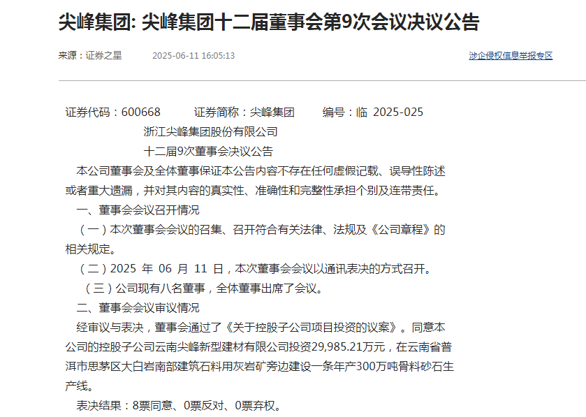 據(jù)公告顯示,經(jīng)審議與表決,董事會(huì)通過了《關(guān)于控股子公司項(xiàng)目投資的議案》。同意本公司的控股子公司云南尖峰新型建材有限公司投資29,985.21萬元,在云南省普洱市思茅區(qū)大白巖南部建筑石料用灰?guī)r礦旁邊建設(shè)一條年產(chǎn)300萬噸骨料砂石生產(chǎn)線。