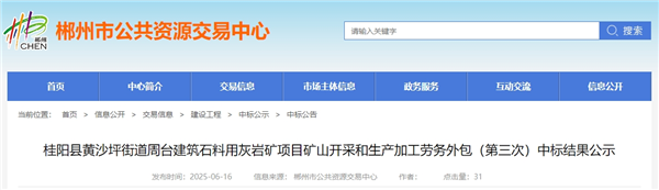 6月16日,湖南省郴州市公共資源交易中心發(fā)布桂陽縣黃沙坪街道周臺(tái)建筑石料用灰?guī)r礦項(xiàng)目礦山開采和生產(chǎn)加工勞務(wù)外包(第三次)中標(biāo)結(jié)果公示。中標(biāo)單位為當(dāng)?shù)孛衿蠛鲜∩爻拷ㄔO(shè)工程有限公司,投標(biāo)總價(jià)超2652.78萬元,碎石投標(biāo)報(bào)價(jià)單價(jià)13.95元/噸,機(jī)制砂投標(biāo)報(bào)價(jià)單價(jià)16.7元/噸。
