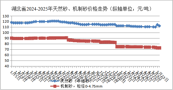 從5月監測數據來看,湖北省砂石價格呈現復雜態勢。天然砂(中粗砂)全省均價為112.03 元/噸,環比上漲1.41%,然而同比卻下降6.91% 。這表明短期內可能存在局部需求增加或供應受限情況,拉動價格環比上升,但從長期市場趨勢看,整體供大于求或需求增長乏力導致同比價格下跌。機制砂全省均價73.32元/噸,環比下降1.12%,同比下降幅度高達18.94%,反映出機制砂市場競爭激烈,隨著機制砂產能不斷擴張,市場飽和度增加,需求端又未同步提升,價格持續承壓下行。