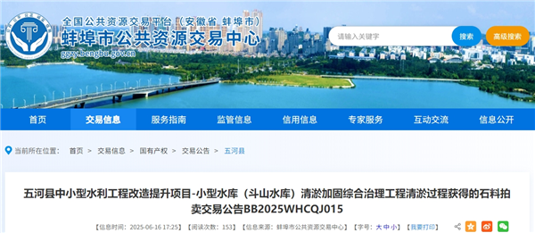 6月16日,安徽省蚌埠市公共資源交易中心發(fā)布五河縣小溪鎮(zhèn)斗山水庫清淤過程獲得的石料拍賣公告,石料數(shù)量約10萬噸,起拍單價(jià)約32元/噸。網(wǎng)絡(luò)報(bào)名時(shí)間為公告發(fā)布之日起至2025年6月23日。