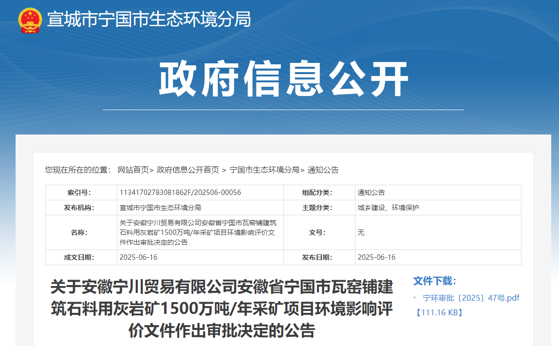 據(jù)悉,2021年12月,安徽寧川貿(mào)易有限公司以9.4億元成功競(jìng)得安徽省宣城市寧國(guó)市瓦窯鋪建筑石料用灰?guī)r礦采礦權(quán)。