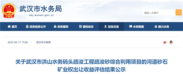 6月17日,湖北省武漢市水務局發布《武漢市洪山水務碼頭疏浚工程疏浚砂綜合利用》項目的河道砂石礦業權出讓收益評估報告。根據報告,本次評估利用資源量即疏浚砂上岸總量12.03萬噸,估值44.36萬元。產品方案為細砂,江砂坑口平均銷售價格83.8元/噸(不含稅)。