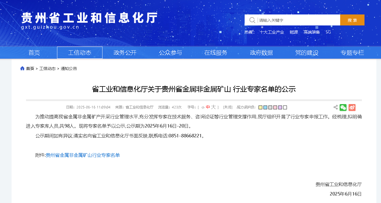 近日,貴州省工業(yè)和信息化廳正式發(fā)布《貴州省金屬非金屬礦山行業(yè)專家名單》,面向社會公示98位涵蓋地質、采礦、選礦等七大領域的資深專家。此舉旨在整合省內礦山行業(yè)高端智力資源,為礦山安全生產、綠色開發(fā)及產業(yè)轉型升級提供專業(yè)技術支撐。