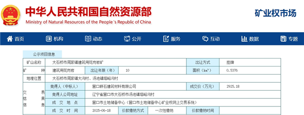近日,遼寧省營口市大石橋市周家鎮建筑用花崗巖礦成功被當地民企——營口耕石建筑材料有限公司成功競得。該礦建筑用花崗巖礦+建筑用大理巖礦總資源量2588.3萬方,生產規模150萬方/年,擬出讓年限10年,成交價2925.18萬元,其他費用近542.3萬元,資源價款約1.34元/方。