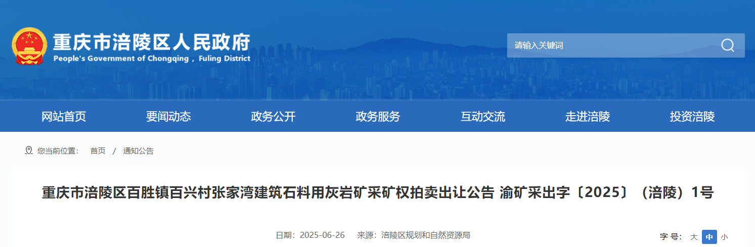 近日,重慶市涪陵區規劃和自然資源局發布涪陵區百勝鎮百興村張家灣建筑石料用灰巖礦采礦權拍賣出讓公告。