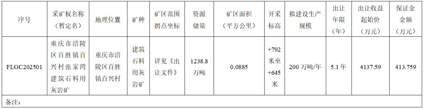 根據公告內容,重慶市涪陵區百勝鎮百興村張家灣建筑石料用灰巖礦,資源儲量1238.8萬噸,擬建設生產規模200萬噸/年,出讓年限5.1年,出讓收益起始價4137.59萬元,保證金413.759萬元。