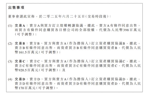 4、交易D:賣方D和田魯新建材、和田堯柏建材、買方與賣方A(作為擔保人)訂立資產(chǎn)購買協(xié)議D,賣方D有條件同意出售,而資產(chǎn)買方D有條件同意購買資產(chǎn)D,代價為人民幣1.7億元。上述價格均可予調(diào)整。