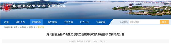 6月24日,湖北省咸寧市嘉魚縣礦山生態修復工程廢棄砂石資源經營權恢復拍賣,拍賣時間定于2025年7月2日。 本次拍賣的砂石經營權運營期共15年(含建設期1年),評估資源量約1133.46萬方(礦石量約2947萬噸),拍賣參考價2976.47萬元,折合1.01元/噸。