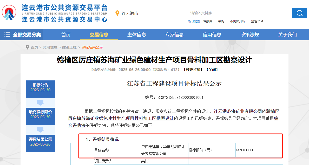 近日,江蘇連云港市公共資源交易中心發(fā)布贛榆區(qū)厲莊鎮(zhèn)蘇海礦業(yè)綠色建材生產項目骨料加工區(qū)勘察設計評標結果公示。根據公示內容,中國電建集團華東勘測設計研究院有限公司成功中標該項目,中標金額445萬元。