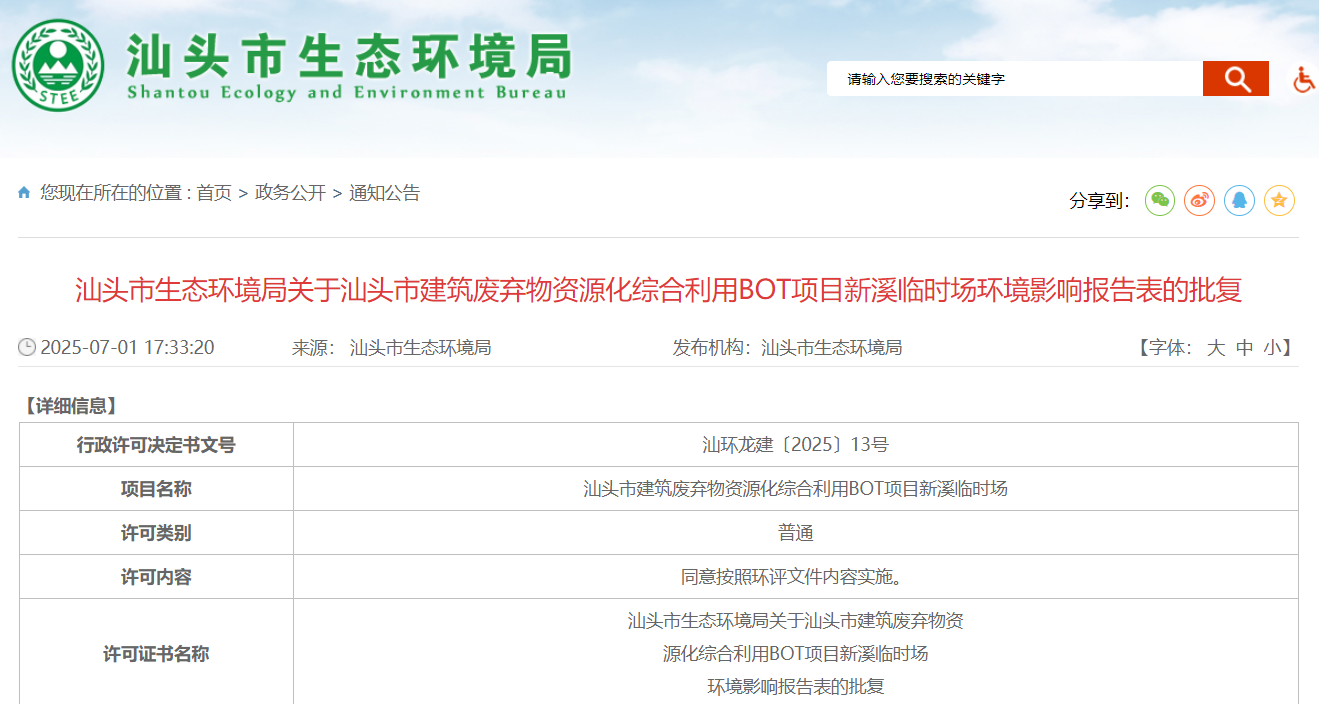 近日,廣東汕頭市生態(tài)環(huán)境局發(fā)布關于汕頭市建筑廢棄物資源化綜合利用BOT項目新溪臨時場環(huán)境影響報告表的批復。