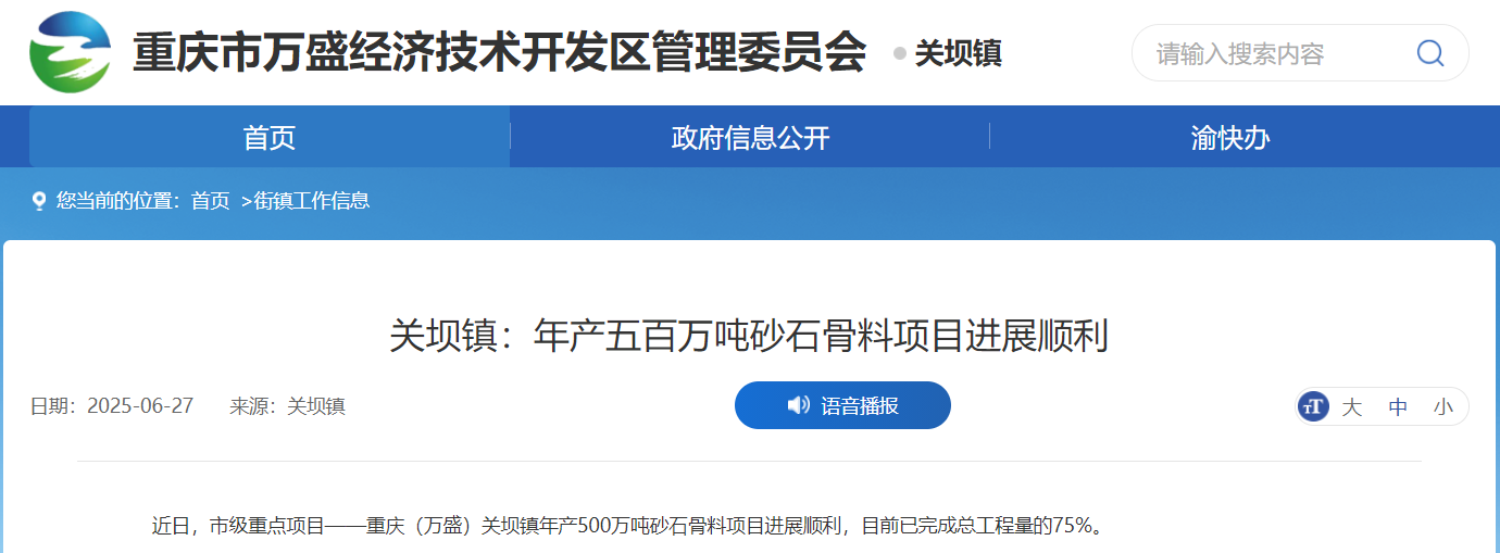 近日,重慶市級重點項目——重慶(萬盛)關(guān)壩鎮(zhèn)年產(chǎn)500萬噸砂石骨料項目進展順利,目前已完成總工程量的75%。