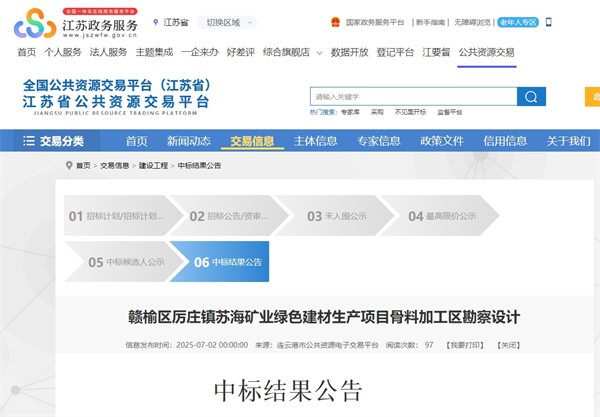 近日,中國電建集團華東勘測設(shè)計研究院有限公司成功中標(biāo)江蘇連云港贛榆區(qū)厲莊鎮(zhèn)蘇海礦業(yè)綠色建材生產(chǎn)項目骨料加工區(qū)勘察設(shè)計評標(biāo)結(jié)果公示。中標(biāo)金額445萬元。