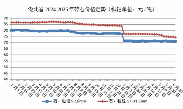 碎石價(jià)格在6月也不容樂觀。碎石(粒徑5-16mm)湖北均價(jià)為71.12元/噸,碎石(粒徑17-31.5mm)湖北均價(jià)為74.69元/噸,環(huán)比分別下降0.32%、1.41%,同比分別下降10.8%、14.01%。從年初價(jià)格來看,1月份時(shí),粒徑5-16mm的碎石均價(jià)約為71.49元/噸,粒徑17-31.5mm的碎石均價(jià)約為77.19元/噸,之后便一直處于下行通道。