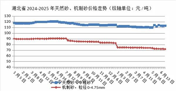在建筑材料市場中,據(jù)監(jiān)測數(shù)據(jù)顯示,湖北天然砂與機(jī)制砂價(jià)格在2025年6月呈現(xiàn)出不同變化。6月份,天然砂(中粗砂)湖北省均價(jià)為113.3元/噸,環(huán)比上漲1.13%,然而同比卻下降5.5%。從年初至今,天然砂價(jià)格在波動中保持相對穩(wěn)定,年初價(jià)格在110元/噸左右徘徊,6月出現(xiàn)小幅回升。