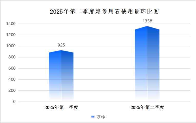 2025第二季度本市建設(shè)用石使用量為1358萬(wàn)噸,同比2024年第二季度1580萬(wàn)噸,下降了14.1%;環(huán)比2025年第一季度925萬(wàn)噸,增長(zhǎng)了46.81%。