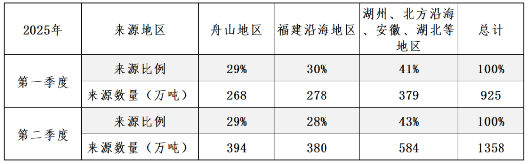 2025年第二季度本市建設(shè)用石來(lái)源:舟山地區(qū)占29%;福建沿海地區(qū)占28%;湖州、北方沿海、安徽、湖北等地區(qū)占43%。