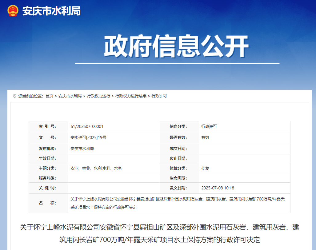 據(jù)悉,安徽安慶水利局發(fā)布懷寧上峰水泥有限公司安徽省懷寧縣扁擔(dān)山礦區(qū)及深部外圍水泥用石灰?guī)r、建筑用灰?guī)r、建筑用閃長(zhǎng)巖礦700萬(wàn)噸/年露天采礦項(xiàng)目水土保持方案行政許可決定,經(jīng)審查,該申請(qǐng)符合法定條件。