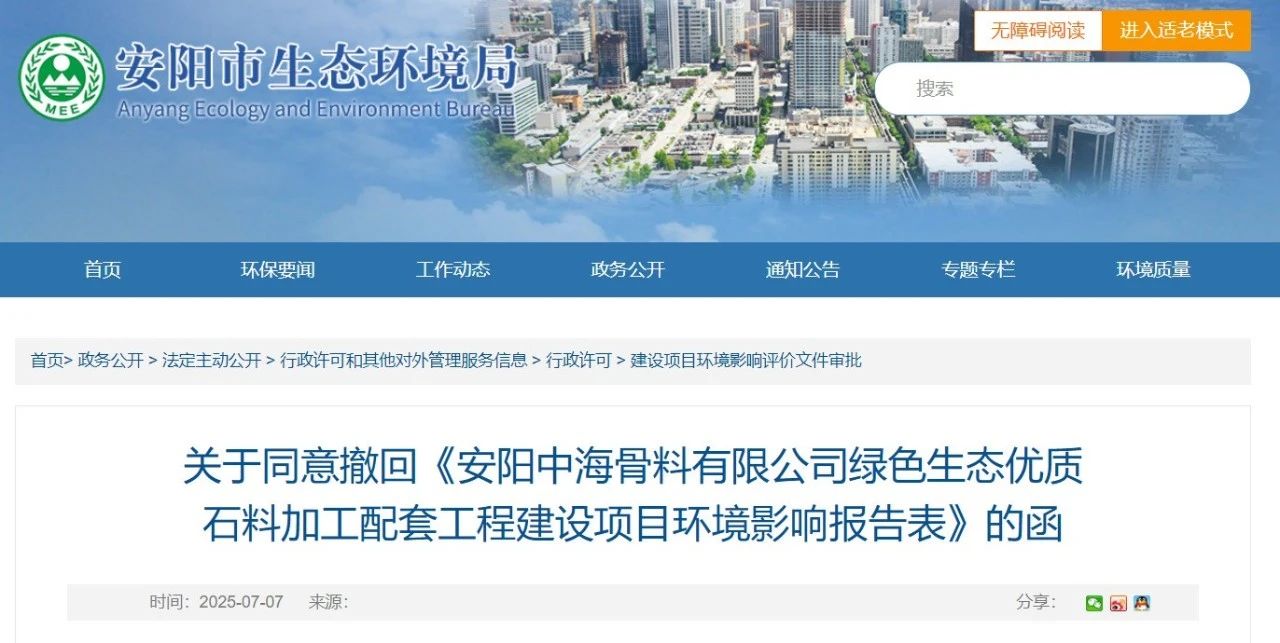 近日,安陽市生態(tài)環(huán)境局發(fā)布關(guān)于同意撤回《安陽中海骨料有限公司綠色生態(tài)優(yōu)質(zhì)石料加工配套工程建設項目環(huán)境影響報告表》的函。
