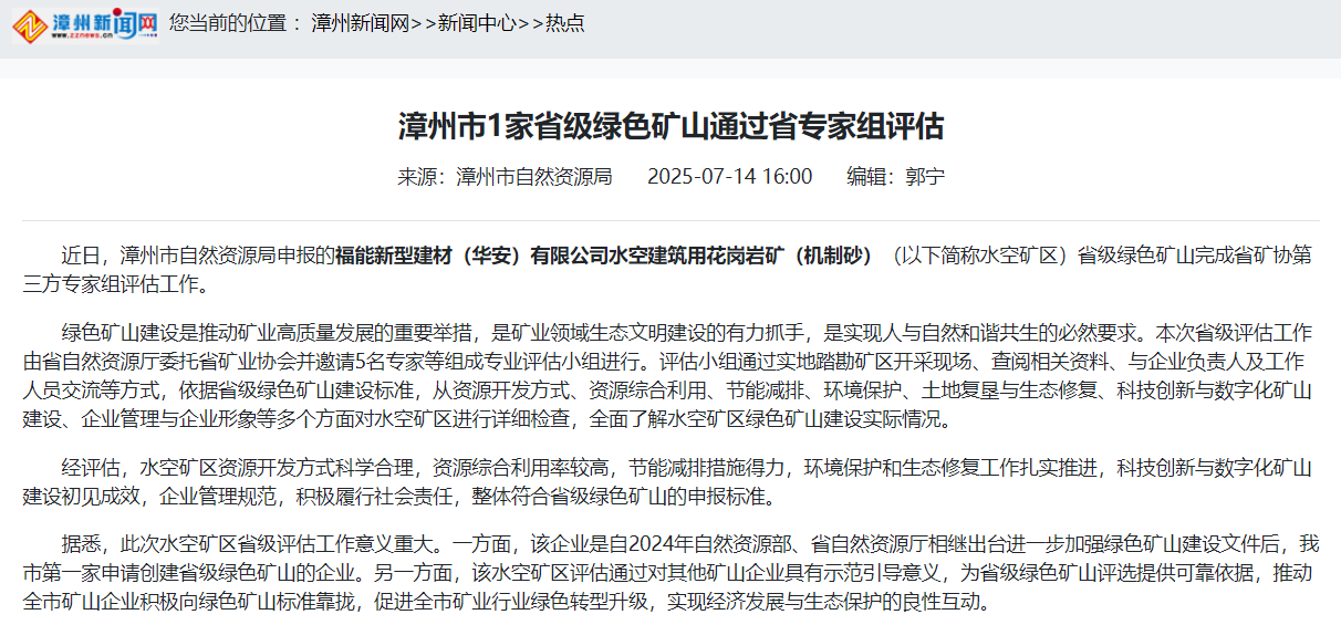 近日,漳州市自然資源局申報(bào)的福能新型建材(華安)有限公司水空建筑用花崗巖礦(機(jī)制砂)(以下簡稱水空礦區(qū))省級綠色礦山完成省礦協(xié)第三方專家組評估工作。