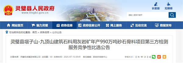 近日,安徽宿州市靈璧縣人民政府發(fā)布堌子山-九頂山建筑石料用灰?guī)r礦年產(chǎn)990萬噸砂石骨料項目第三方檢測服務(wù)競爭性比選公告。