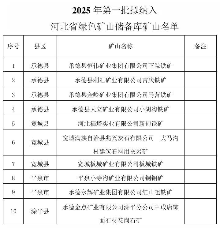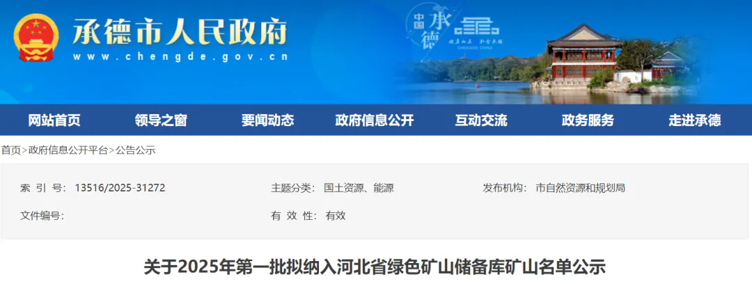 承德市自然資源和規劃局 關于2025年第一批擬納入 河北省綠色礦山儲備庫礦山名單公示