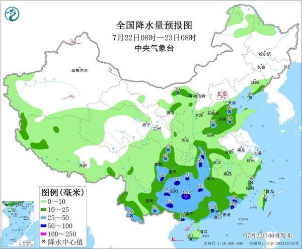 7月22日8時至23日8時,華南、江南西部、西南地區(qū)東部和南部、江漢西部、黃淮北部等地的部分地區(qū)有中到大雨,其中,湖北西部、湖南中西部、四川盆地南部、貴州、廣西南部和北部、廣東中南部等地的局部地區(qū)有暴雨或大暴雨(100~140毫米)。新疆東部和南疆盆地有4~6級風。