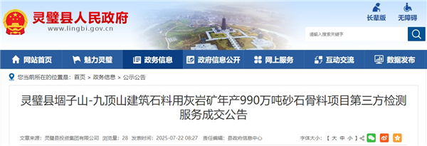 7月22日,安徽省宿州市靈璧縣人民政府發(fā)布堌子山-九頂山建筑石料用灰?guī)r礦年產(chǎn)990萬噸砂石骨料項目第三方檢測服務(wù)成交公告,安徽建工檢測科技集團有限公司以8.2元/平方米的價格順利中標。
