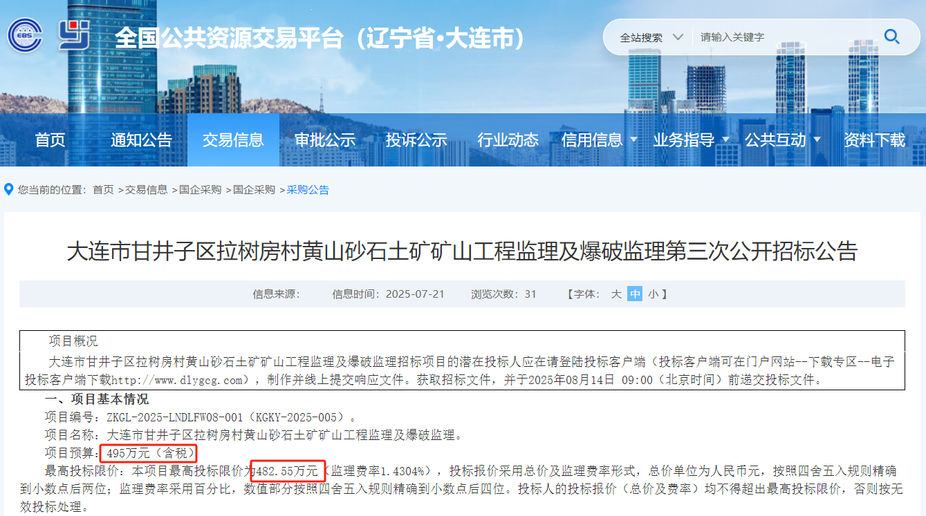 近日,遼寧省大連市公共資源交易平臺發(fā)布大連市甘井子區(qū)拉樹房村黃山砂石土礦礦山工程監(jiān)理及爆破監(jiān)理第三次公開招標(biāo)公告。項目預(yù)算495萬元(含稅)最高投標(biāo)限價為482.55萬元。