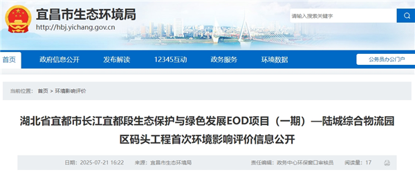 7月21日,湖北省宜昌市生態環境局發布宜都市長江宜都段生態保護與綠色發展EOD項目(一期)——陸城綜合物流園區碼頭工程首次環境影響評價信息。