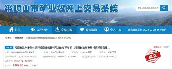 近日,河南汝州焦村鎮郭嶺南建筑石料用灰巖礦采礦權成功出讓。 據了解,該項目設計可采儲量2791.51萬噸,生產規模300萬噸/年,汝州市銳源礦業有限公司以底價9162.26萬元競得該項目。
