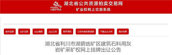 7月29日,湖北省恩施利川市湖碧凼礦區建筑石料用灰巖礦采礦權掛牌出讓。該礦資源儲量2857.1萬噸,生產規模150萬噸/年,出讓年限19年,起始價3293萬元,其他費用4532.75萬元,資源價款約2.74元/噸。