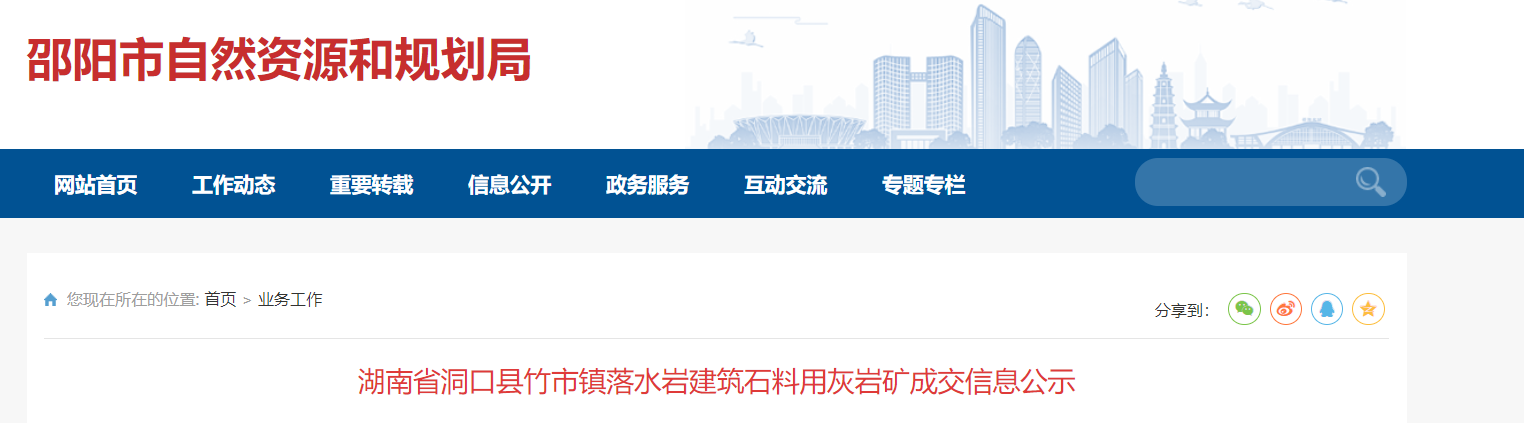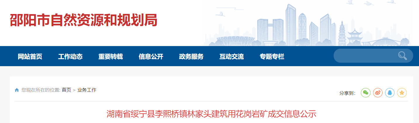邵陽縣誠熙建材有限公司(當地民企)以底價4197萬元拍得綏寧縣李熙橋鎮林家頭建筑用花崗巖礦采礦權,該礦權控制資源量1253.9萬噸,生產規模100萬噸/年。