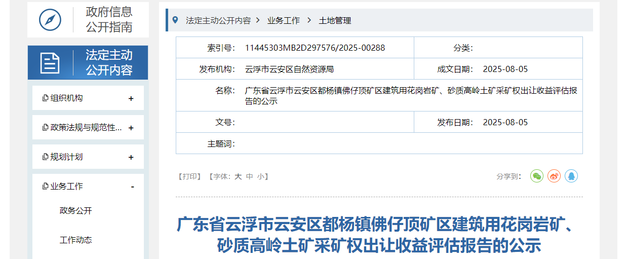 近日,廣東云浮云安區(qū)自然資源局發(fā)布都楊鎮(zhèn)佛仔頂?shù)V區(qū)建筑用花崗巖礦、砂質(zhì)高嶺土礦采礦權(quán)出讓收益評估報告的公示。