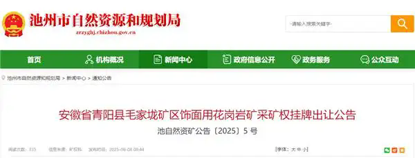 近日,安徽省池州市自然資源和規劃局發布青陽縣毛家垅礦區飾面用花崗巖礦采礦權掛牌出讓公告,掛牌時間為2025年9月9日至2025年9月22日。該礦資源總量1515.85萬方,擬設生產規模55萬方/年,擬出讓年限26.3年,起始價2.1億元,資源價款約13.85元/方。