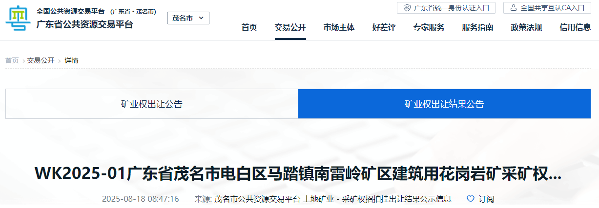 近日,廣東省公共資源交易平臺(tái)發(fā)布WK2025-01廣東省茂名市電白區(qū)馬踏鎮(zhèn)南雷嶺礦區(qū)建筑用花崗巖礦采礦權(quán)(成交公示)。當(dāng)?shù)貒?guó)企茂名市茂盛公共資源開發(fā)有限公司以24852.08萬(wàn)元競(jìng)得該項(xiàng)目。