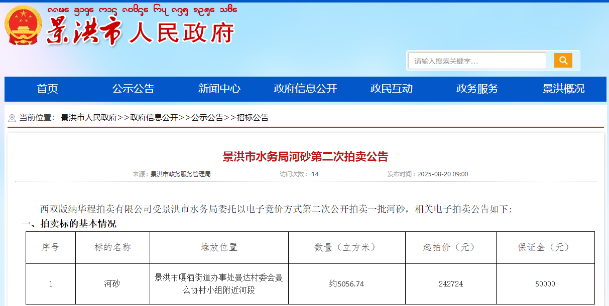 近日,西雙版納華程拍賣(mài)有限公司受景洪市水務(wù)局委托以電子競(jìng)價(jià)方式第二次公開(kāi)拍賣(mài)一批河砂,此次拍賣(mài)的河砂約5056.74方,起拍價(jià)24.2724萬(wàn)元,增價(jià)幅度為人民幣1000元/次或其整倍數(shù)。本次拍賣(mài)不允許以聯(lián)合體方式參與競(jìng)買(mǎi)。