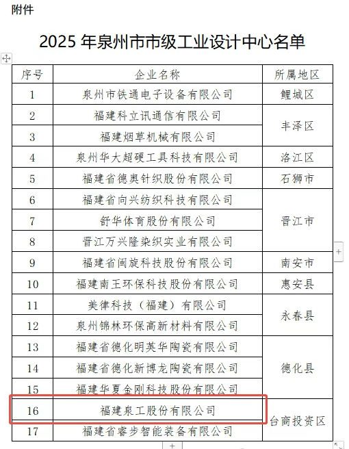 近日,泉州市工業(yè)和信息化局正式發(fā)布了《關(guān)于公布2025年泉州市市級(jí)工業(yè)設(shè)計(jì)中心名單的通知》,全市共有17家企業(yè)上榜。其中,福建泉工股份有限公司深耕智能磚機(jī)與固廢綜合利用裝備領(lǐng)域,憑借在工業(yè)設(shè)計(jì)創(chuàng)新、研發(fā)體系建設(shè)及成果轉(zhuǎn)化等方面的突出表現(xiàn)成功入選。