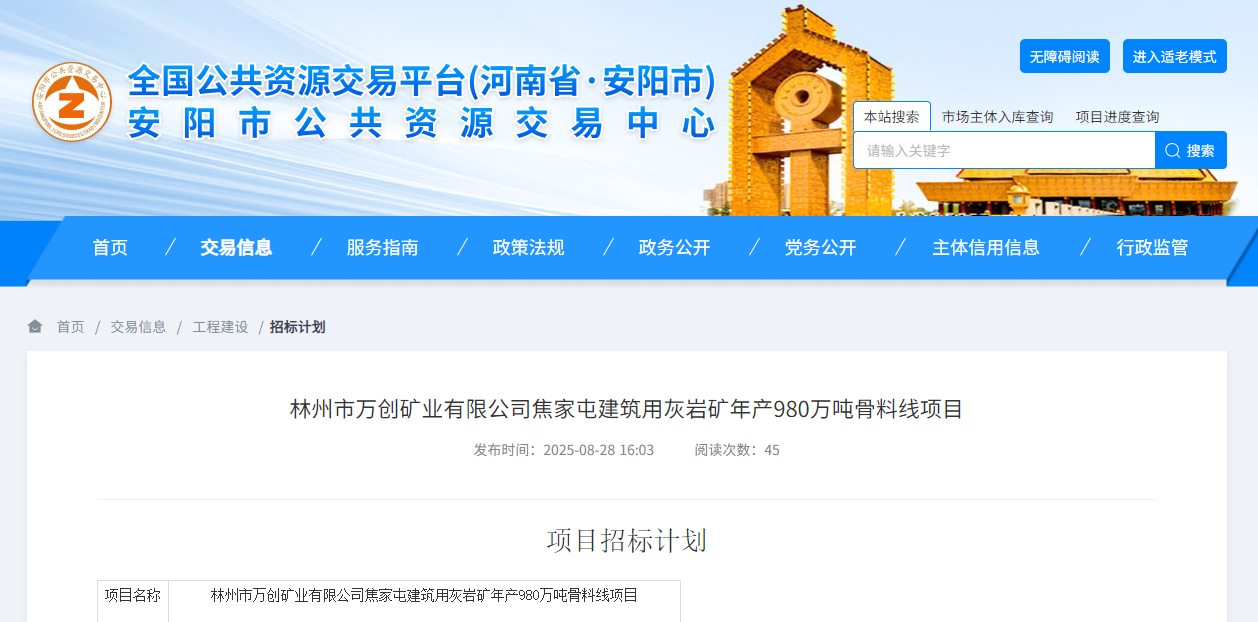 近日,河南安陽市公共資源交易中心發(fā)布林州市萬創(chuàng)礦業(yè)有限公司焦家屯建筑用灰?guī)r礦年產(chǎn)980萬噸骨料線項(xiàng)目招標(biāo)計(jì)劃。