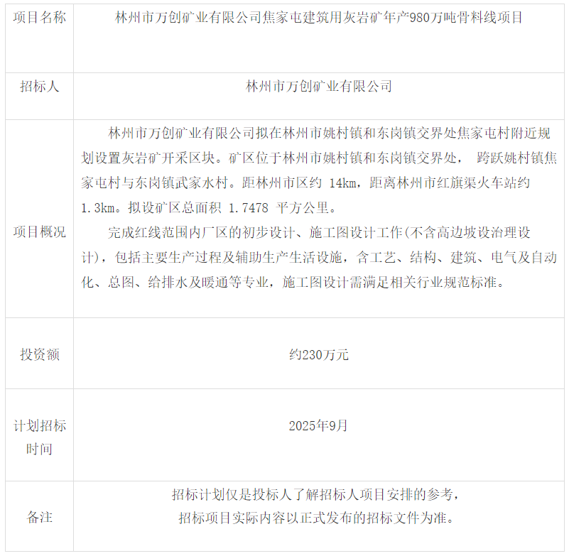 根據(jù)招標(biāo)計(jì)劃內(nèi)容,林州市萬創(chuàng)礦業(yè)有限公司擬在林州市姚村鎮(zhèn)和東崗鎮(zhèn)交界處焦家屯村附近規(guī)劃設(shè)置灰?guī)r礦開采區(qū)塊,招標(biāo)項(xiàng)目投資額約230萬元,要求完成項(xiàng)目紅線范圍內(nèi)廠區(qū)的初步設(shè)計(jì)、施工圖設(shè)計(jì)工作(不含高邊坡設(shè)治理設(shè)計(jì)),包括主要生產(chǎn)過程及輔助生產(chǎn)生活設(shè)施,含工藝、結(jié)構(gòu)、建筑、電氣及自動(dòng)化、總圖、給排水及暖通等專業(yè),施工圖設(shè)計(jì)需滿足相關(guān)行業(yè)規(guī)范標(biāo)準(zhǔn)。