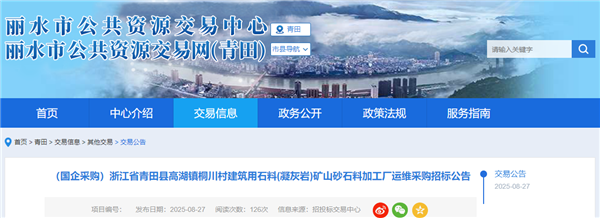 近日,浙江省麗水市青田縣高湖鎮(zhèn)桐川村建筑用石料(凝灰?guī)r)礦山砂石料加工廠運維采購招標(biāo),投標(biāo)截止時間為2025年9月16日。該項目最高限價7435萬元,其中投入生產(chǎn)前設(shè)備維修更新費用300萬元,..